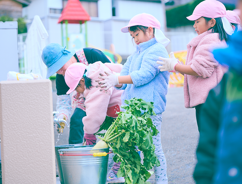 私たちの保育理念は、子どもたちが、園をとりまくコミュニティーの中で様々な人・モノ・コトに触れ合うことで、 自ら気づきや好奇心を持ち、一人ひとりの興味関心や個性に合ったプロセスで学びを深めることが最も重要なことと捉えています。